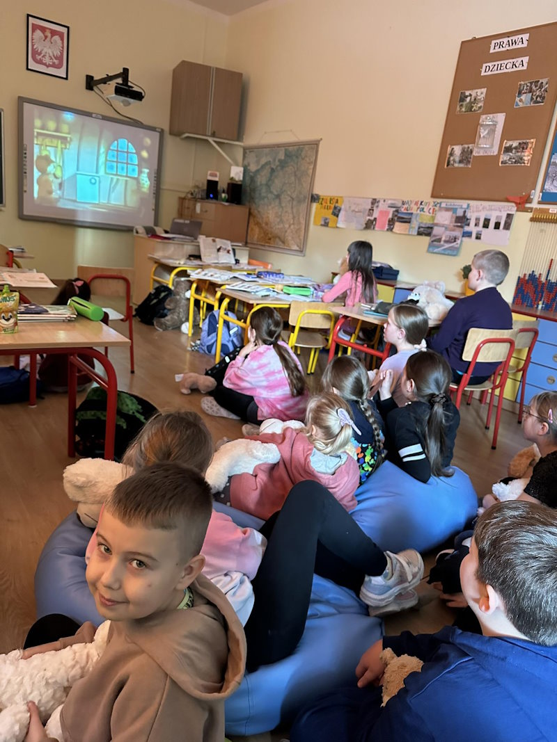 W poniedziałek, 27 listopada 2023 roku klasy I – III obchodziły Światowy Dzień Pluszowego Misia. Spotkanie rozpoczęło się prezentowaniem przyniesionych przez uczniów misiów. Każdy mógł powiedzieć kilka zdań o swoim ulubionym misiu. Pani H. Dudek opowiedziała historię powstania maskotki – misia. Następnie dzieci rozmawiały o znanych misiach pochodzących z różnych bajek. Okazało się, że uczniowie znają ich mnóstwo… Pani bibliotekarka I. Kapcia zapoznała uczestników spotkania z informacjami na temat życia niedźwiedzi. W ten sposób dzieci poszerzyły swoją wiedzę, wzbogaciły ją szczególnie o informacje, jak zachować się w przypadku spotkania zwierzęcia na szlaku, w górach. Grupa recytowała również wiersze o misiach, bo o dziwo znamy ich sporo. Później uczniowie słuchali piosenek o misiach, oglądali film „Miś Coralgol. Zimowe kłopoty”. Dzieci otrzymały także kolorowanki do pokolorowania. Panie organizatorki zadbały o słodki poczęstunek – andrut z miodem. Uczniowie miło i radośnie spędzili czas. Miś pluszowy był w centrum uwagi, jako ich ulubiona, świętująca właśnie zabawka.